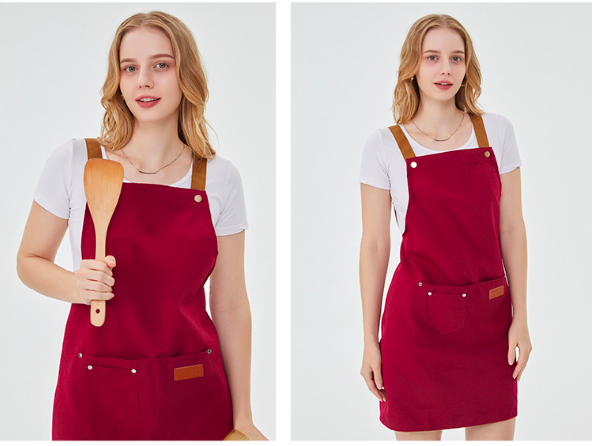 保育現場での実用性と見た目の良さを兼ね備えた、調節可能なストラップ付きエプロン。