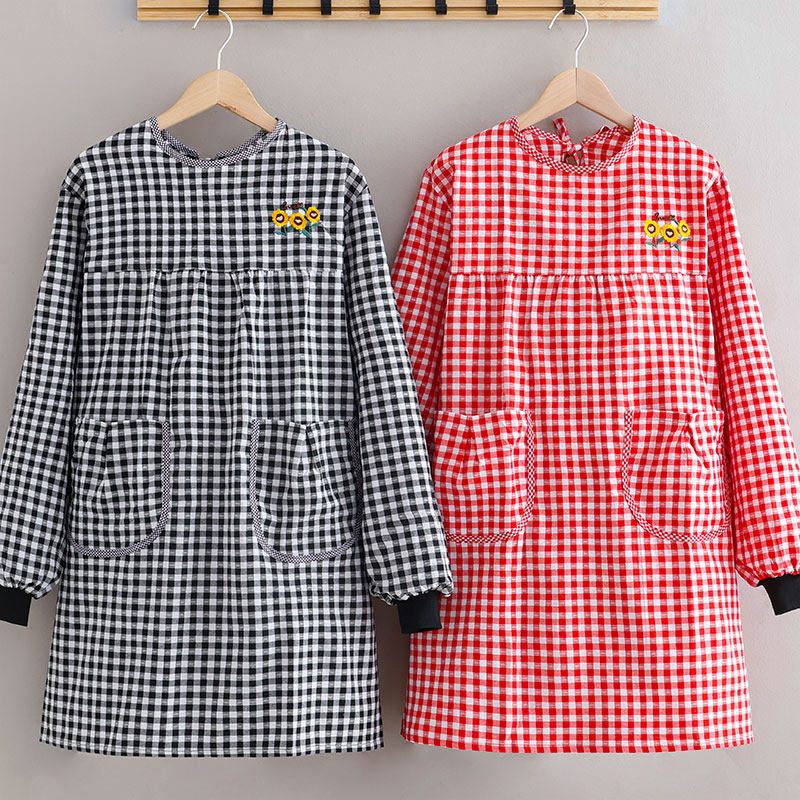 キュートな格子柄が特徴の保育士エプロンです。 胸元にはかわいい動物の刺繍ワンポイントが施され、子どもたちの笑顔を引き出します。 両サイドには大きめのポケットが付いており、ティッシュや小物の収納に便利です。 袖口はリブ仕様で動きやすく、長袖タイプなので一年を通して活躍するスモックです。 被るだけで簡単に着用でき、保育現場での実用性も抜群です。
