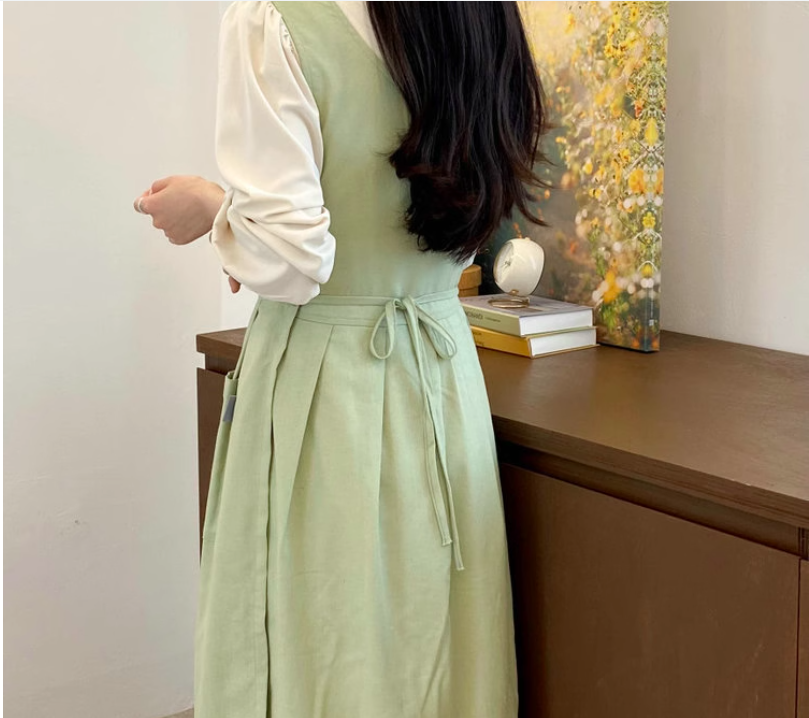 白いブラウスと重ね着したデザインが、洗練された雰囲気を演出します。