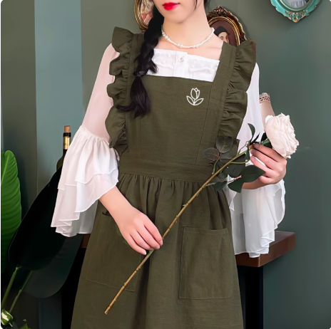 保育士にぴったりのシンプルなH型エプロン。クラシカルなデザインが特徴で、フリル付きの肩紐やスクエアネックがレトロな魅力を醸し出します。快適なゆったりシルエットと実用的な大きなポケットを搭載。白い長袖シャツと合わせることで、上品かつ華やかなスタイルを演出。日々の保育活動をスタイリッシュにサポートする一着です。